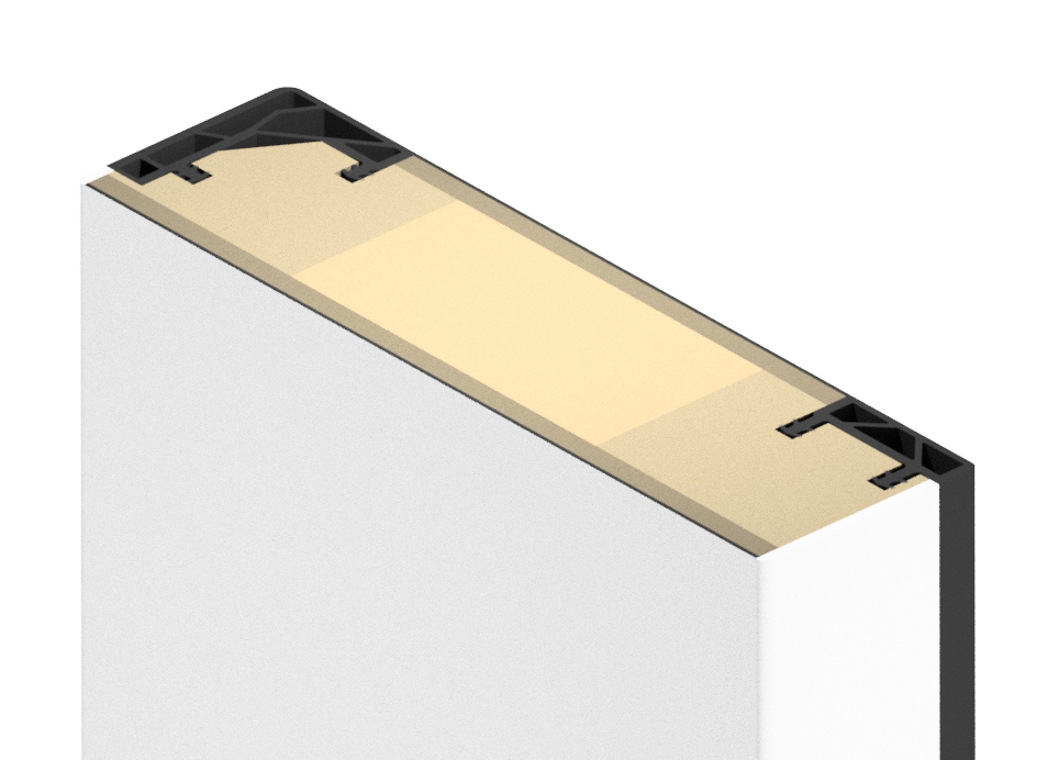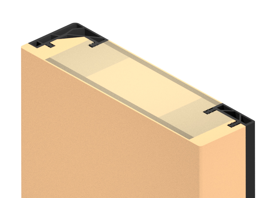Bei der Küffner-Fingerschutztür muss der Spalt der Nebenschließkante nicht mehr durch einen Rollo abgedeckt werden. Die „weiche“ Türkante wird durch die integrierte Knautschzone bis tief in den Türspalt „entschärft“. Außerdem bietet das Küffner-Fingerschutzsystem eine weitere Knautschzone an der gefährlichen Schlosskante.