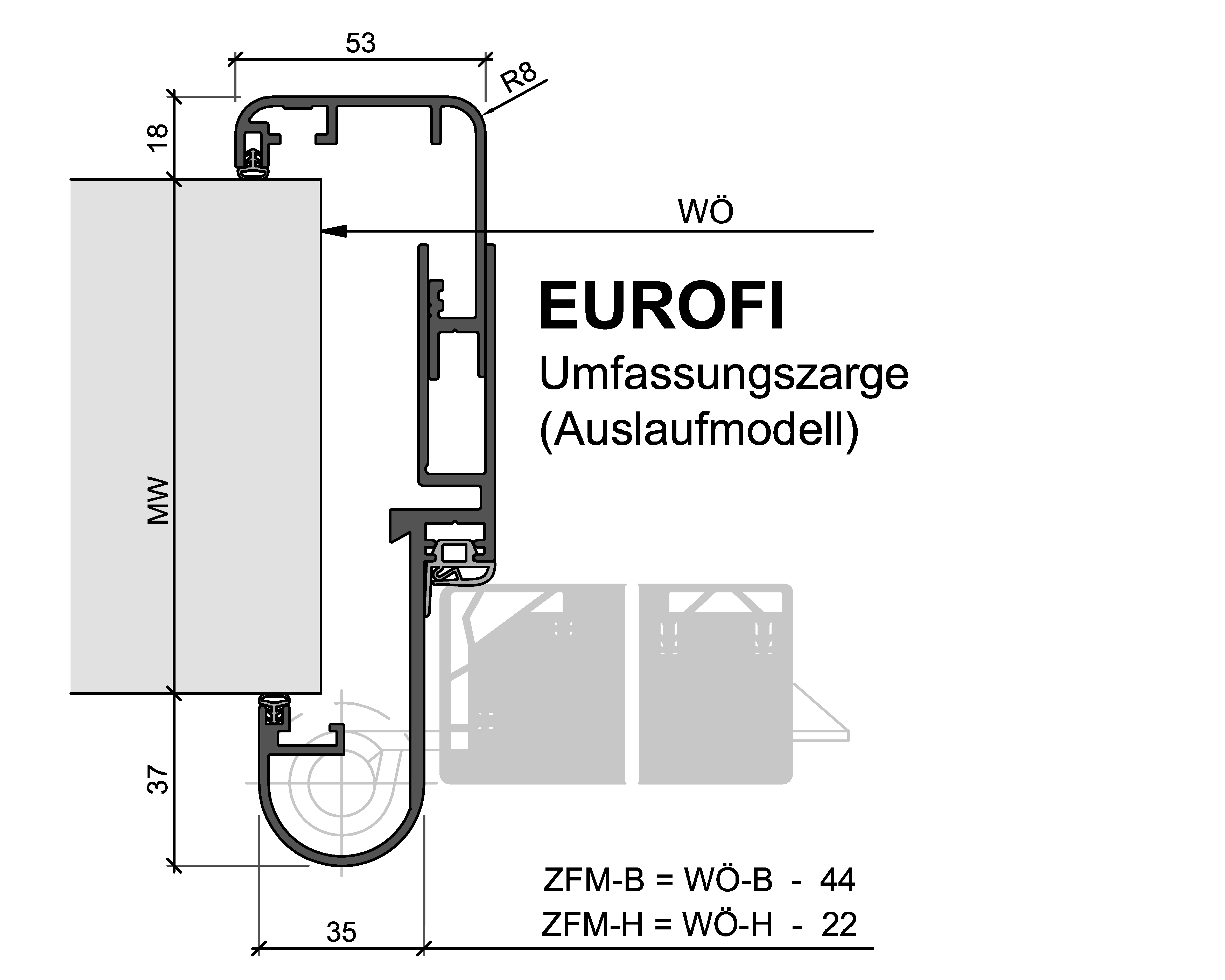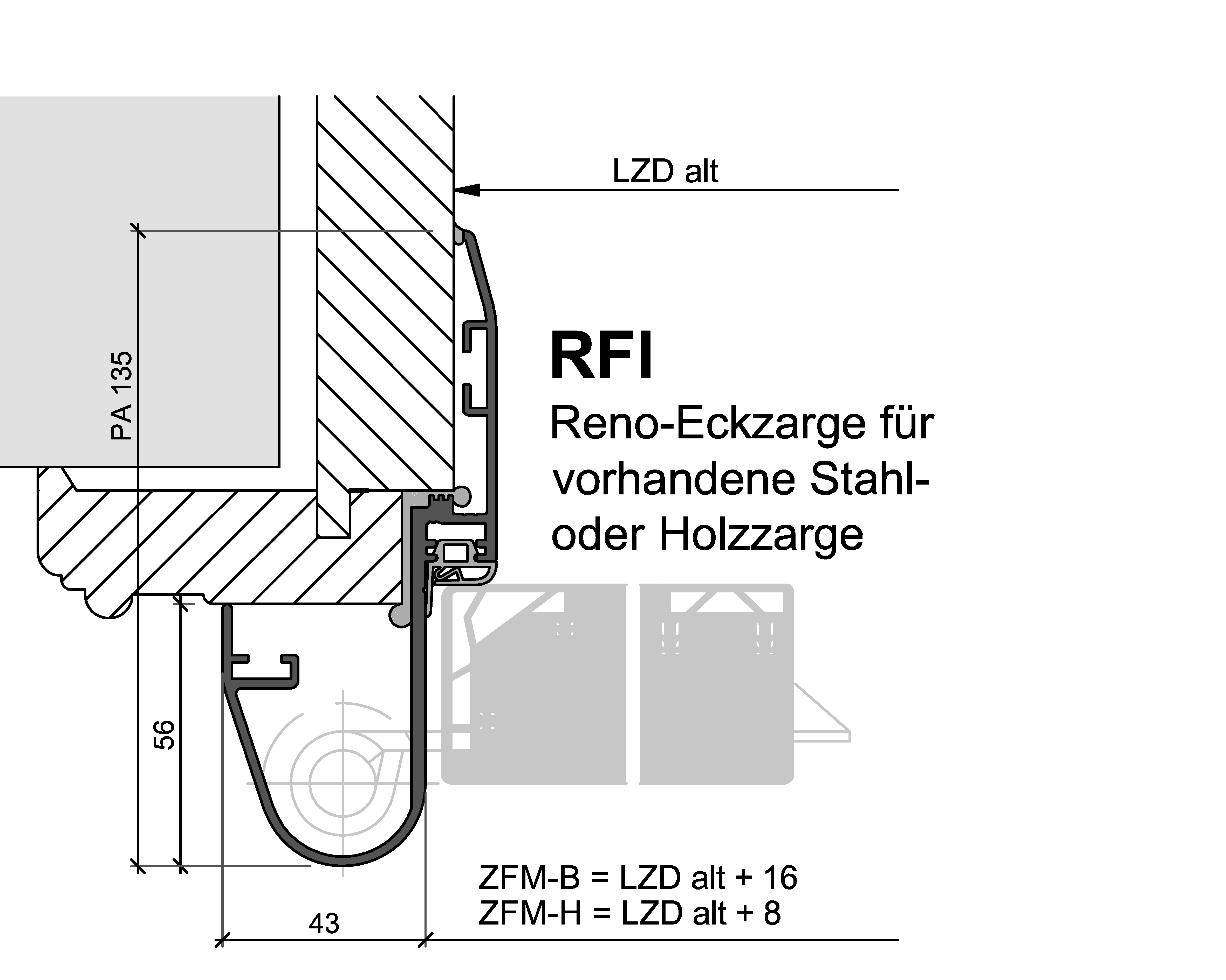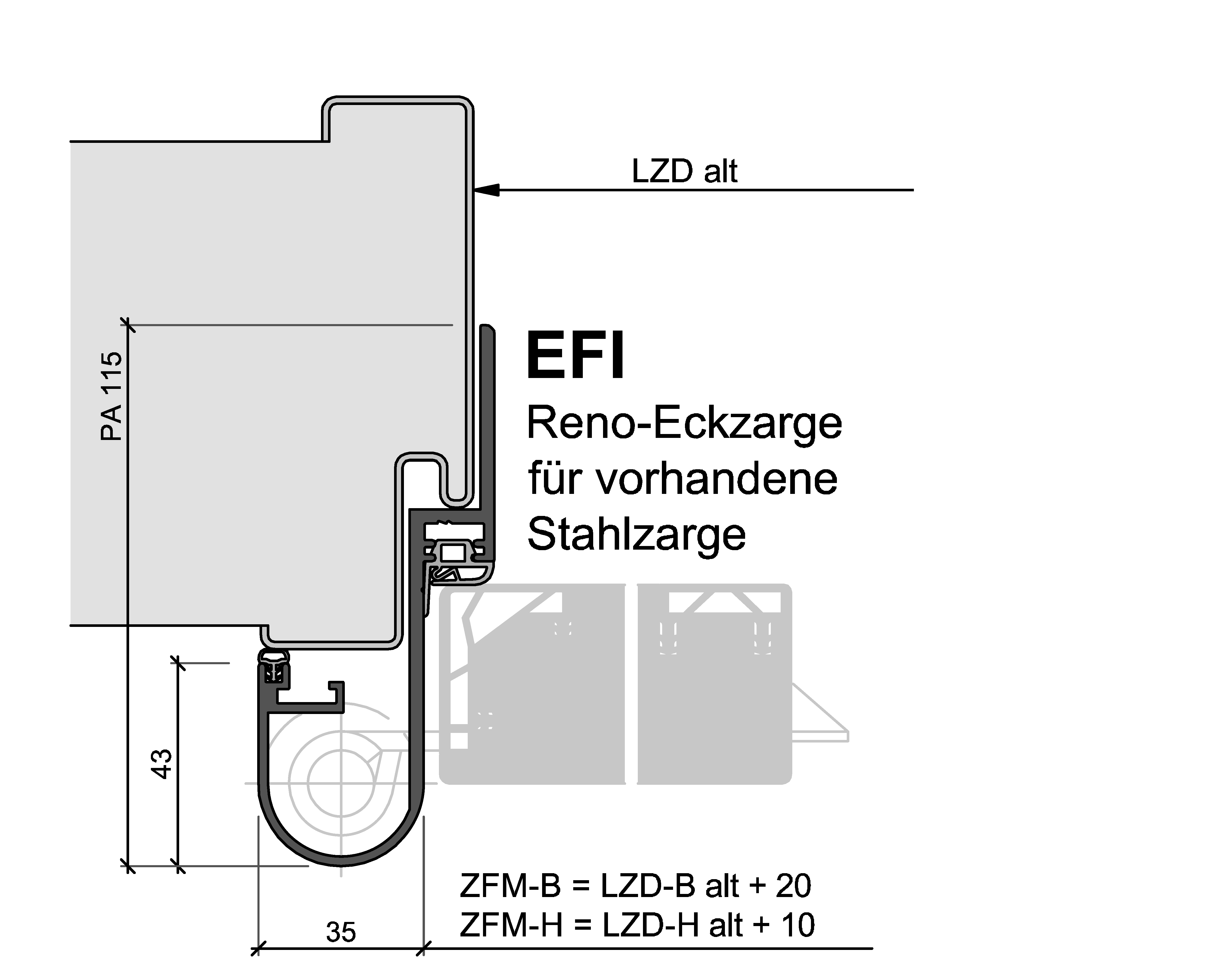 Eloxierte Aluminiumzargen, teilweise mit Oberlicht und / oder Glasseitenteil. Die Glashalteleisten der rechteckigen Tür-Lichtausschnitte wurden passend zur Türoberfläche ausgeführt.