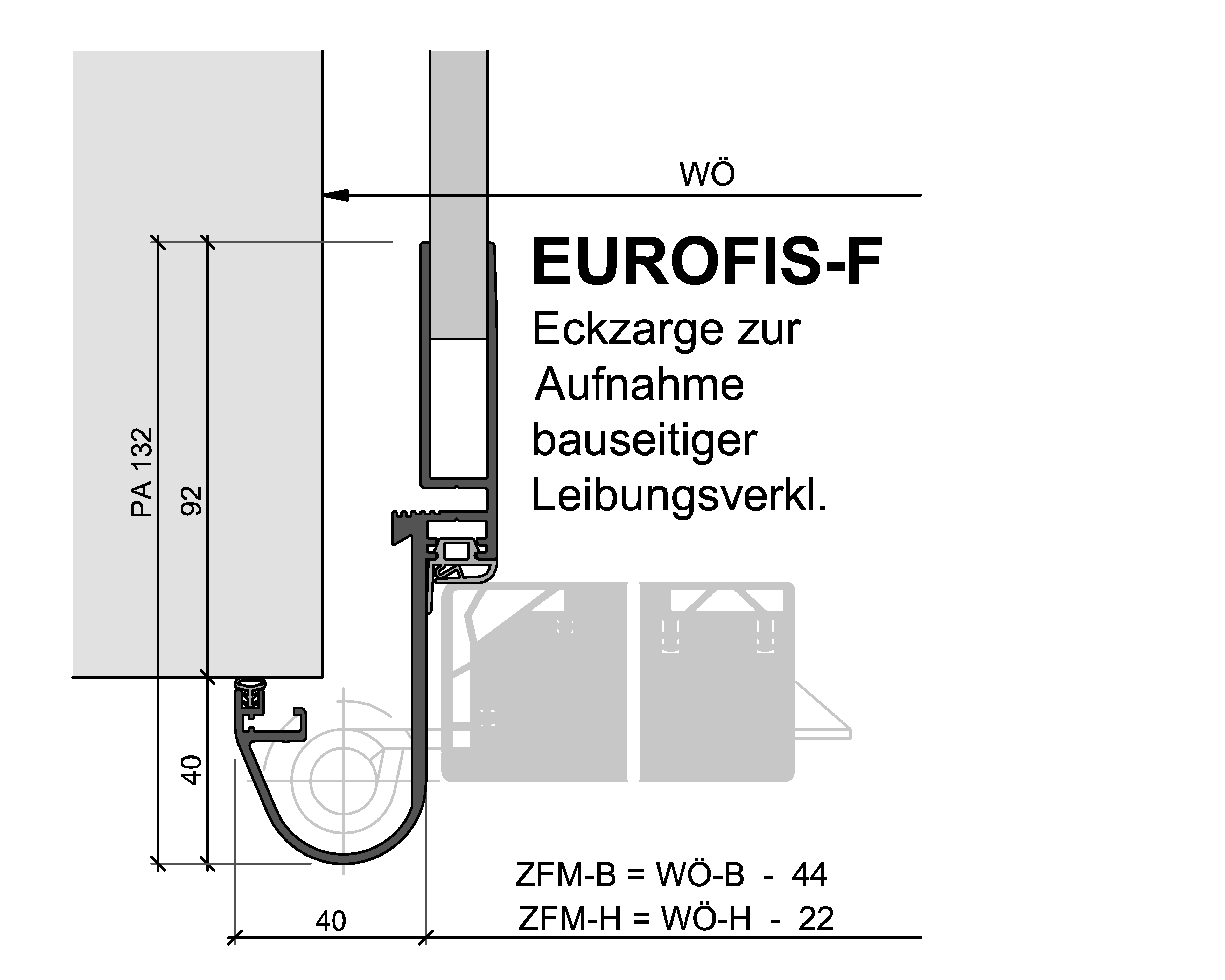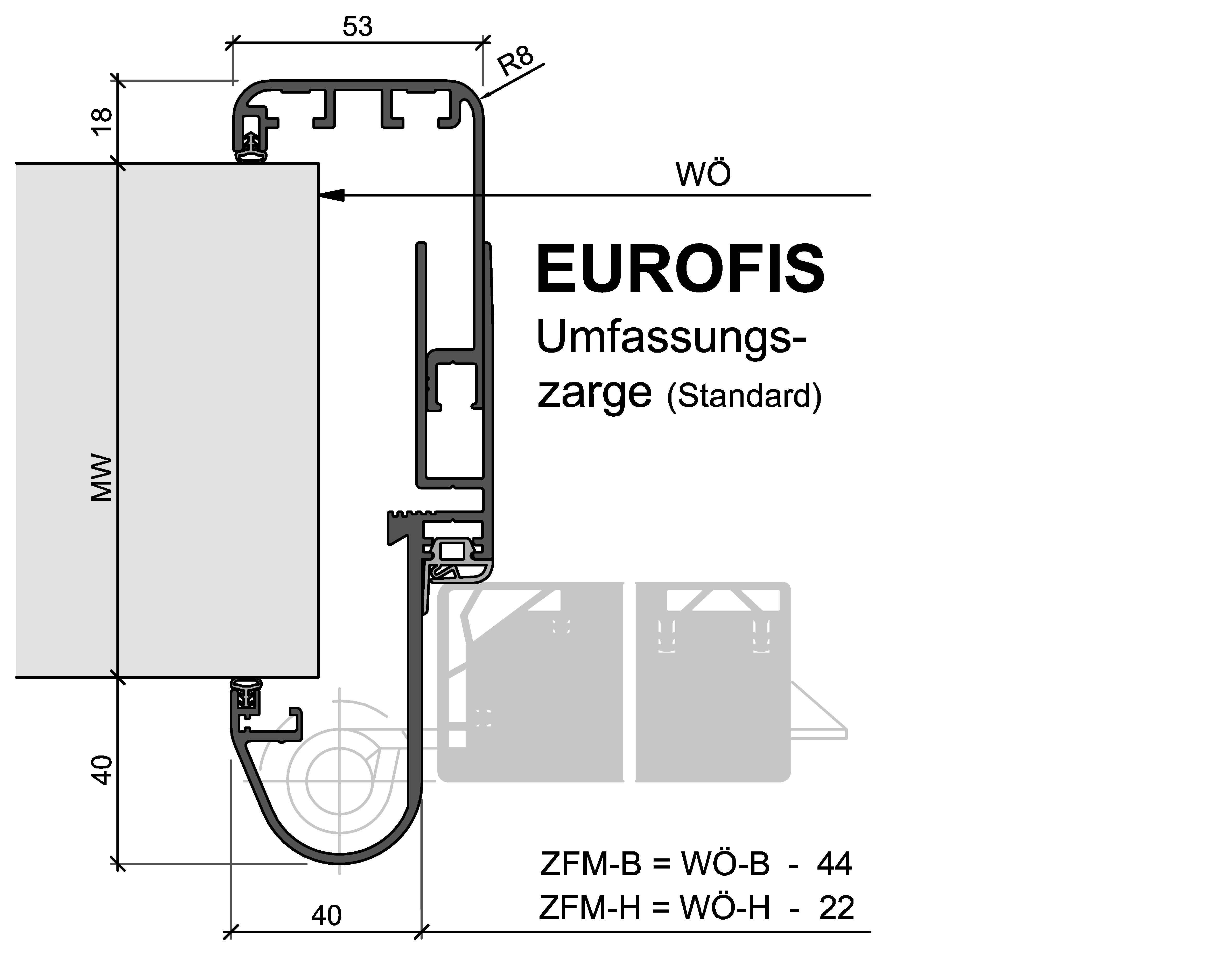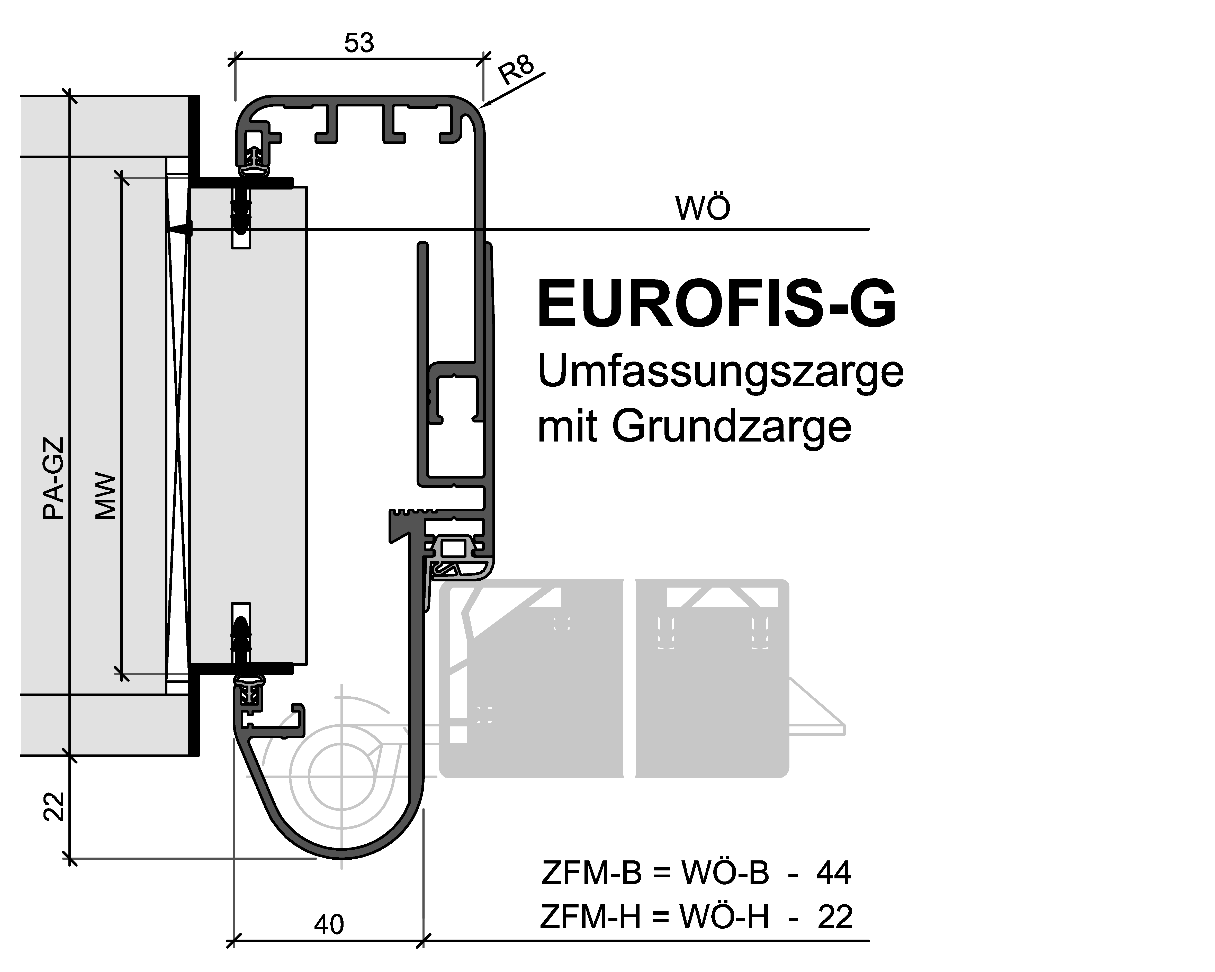 Eloxierte Aluminiumzargen, teilweise mit Oberlicht und / oder Glasseitenteil. Die Glashalteleisten der rechteckigen Tür-Lichtausschnitte wurden passend zur Türoberfläche ausgeführt.