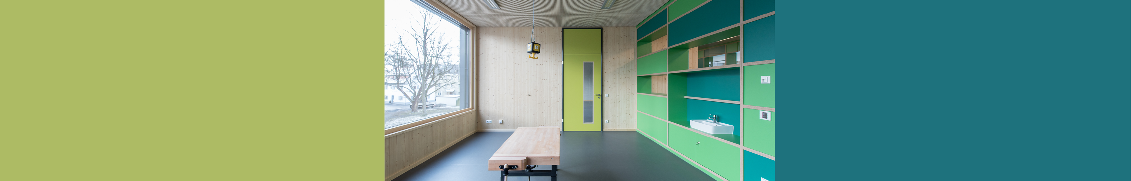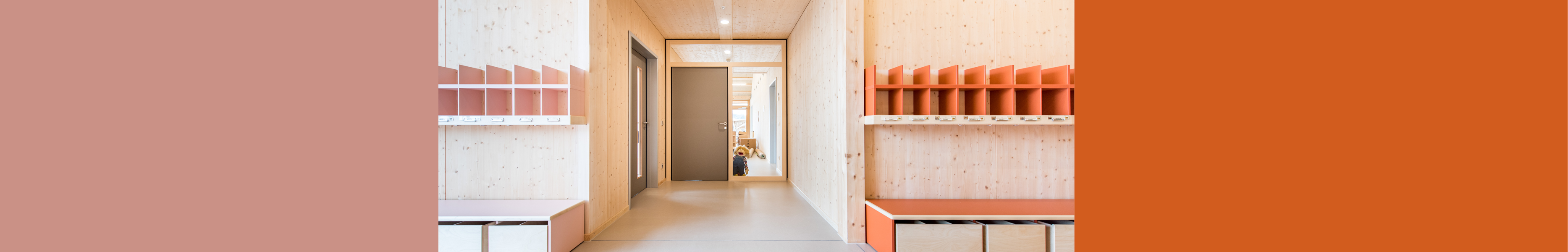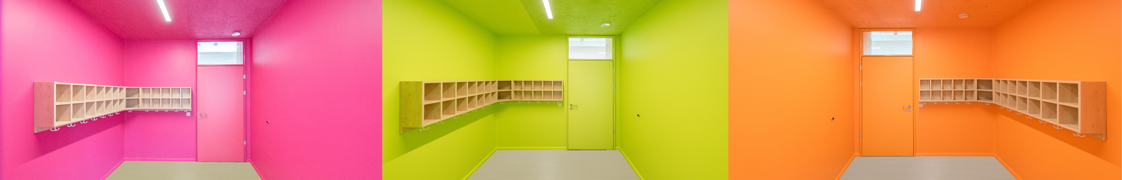 Acht aufeinander abgestimmte, dezente Farben finden sich an verschiedenen Stellen im Gebäude wieder und werden bewusst zurückhaltend eingesetzt, um viel Spielraum für die „Buntheit“ der Kinder zu lassen und optisch ruhige Räume zu schaffen.