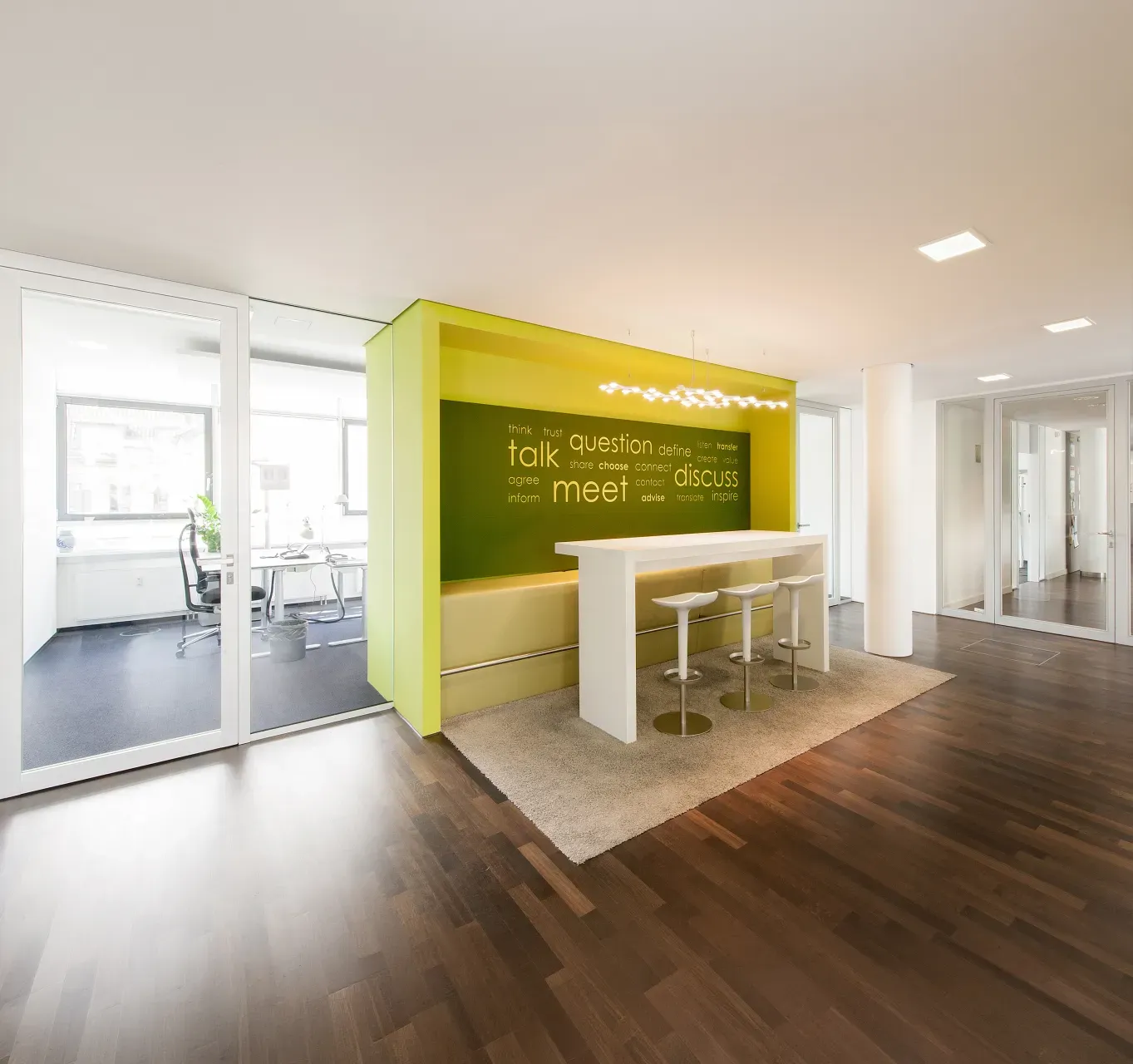 Flächenbündige Rahmentüren aus Aluminium bilden in diesem sehr hellen Bürogebäude die transparenten Abschlüsse zu den einzelnen Büros. Die mit der Tür flächenbündige Zarge dient gleichzeitig als aussteifendes Element für die Konstruktion der Glaswand. Für Zugänge und Flurabschlüsse geeignet, sind die Rahmentüren von Küffner eine beanspruchbare und robuste Alternative zu Ganzglastüren. Die schlanken Rahmentüren sorgen mit ihrem großen Glasanteil für die gewünschte Transparenz im Innenausbau.
