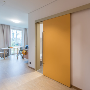 Die Küffner Raumspartür findet in Bereichen des barrierefreien Bauens und Wohnens sowie zur Inklusion von Menschen mit Einschränkungen ihre ideale Bestimmung. Die barrierefreie Tür kann ohne unfallträchtiges Manövrieren mit Rollstuhl und Rollator selbständig benutzt werden. Das Türblatt öffnet lediglich auf 90°. Die Türklinke bleibt dadurch stets erreichbar und kann auch bei geöffneter Tür von beiden Seiten des Durchgangs einfach bedient werden. Dies bewahrt die Selbständigkeit von Menschen mit Gehhilfe, Rollator oder Rollstuhl und erhält die Würde bei der unabhängigen Nutzung von Toilette und Bad.