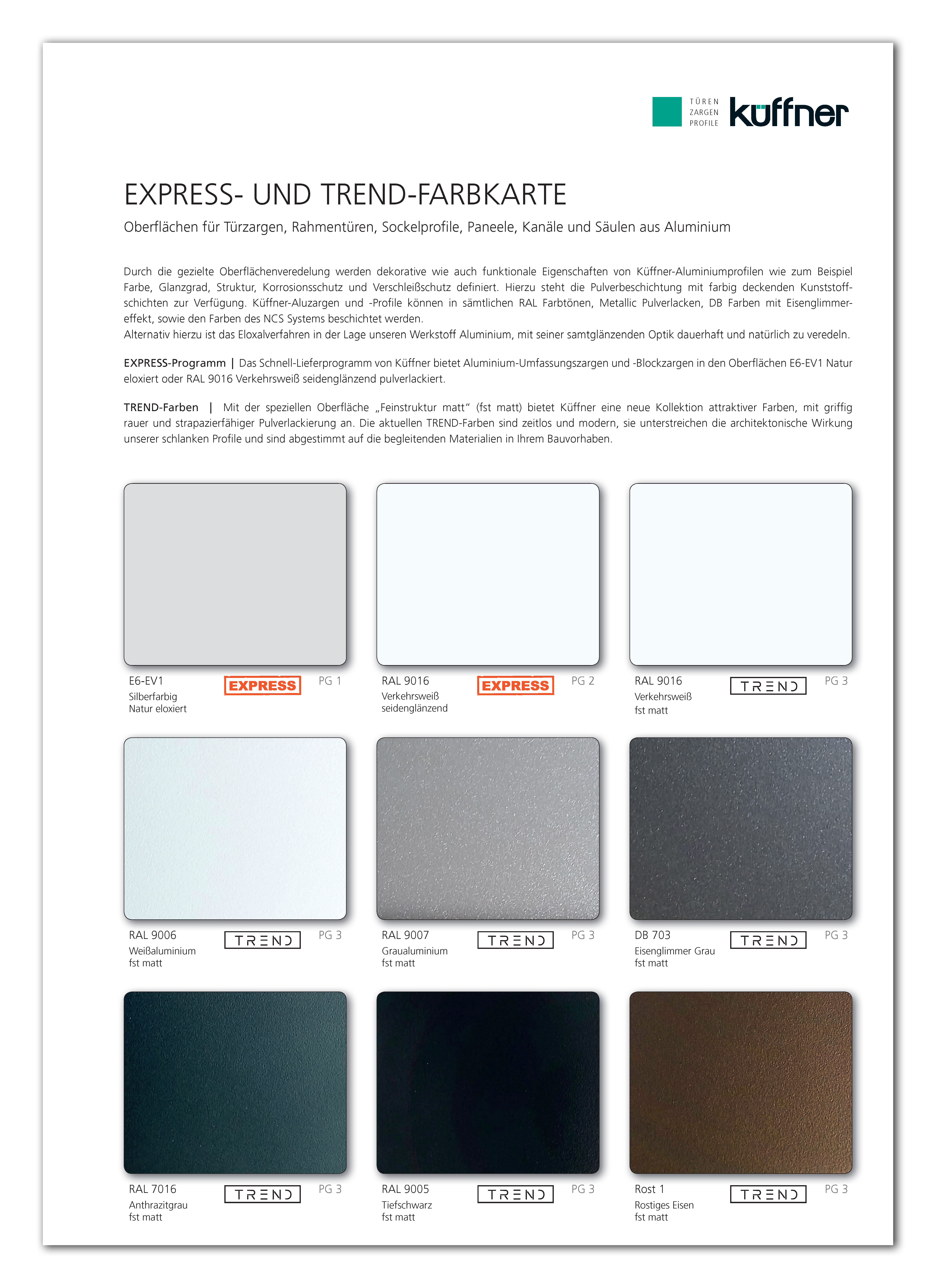 Bitte haben Sie Verständnis, dass wir unsere Musterkarten "Aluminiumoberflächen" nicht kostenlos versenden können. Sie können die folgenden Küffner Farbkarten bestellen, erhalten jedoch parallel hierzu einen Gutschein über die identische Summe, welchen Sie bei einer Bestellung einlösen können.